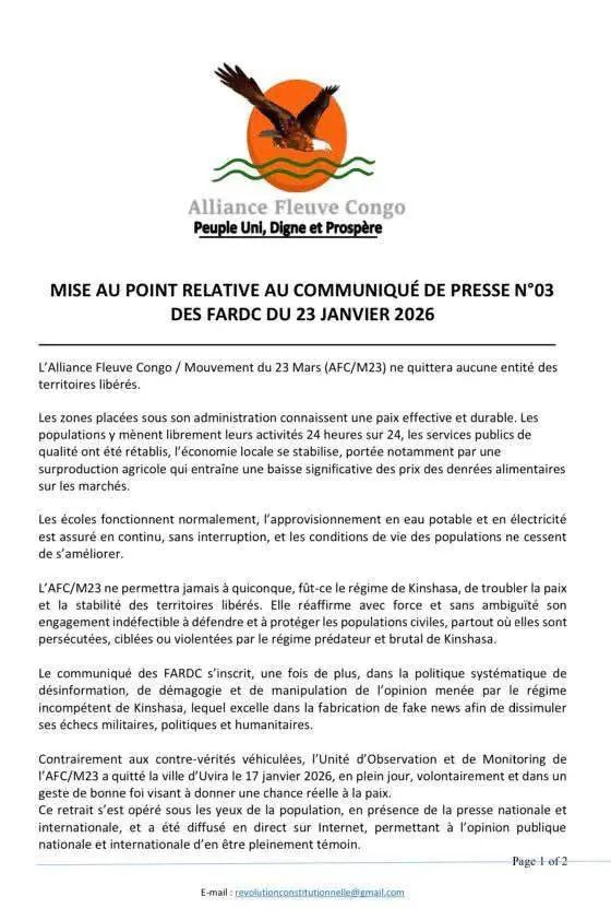 Cette position, exprimée dans un communiqué rendu public ce lundi 26 janvier 2026, contredit directement une récente communication des Forces armées de la République démocratique du Congo (FARDC) annonçant une évolution sur le terrain.